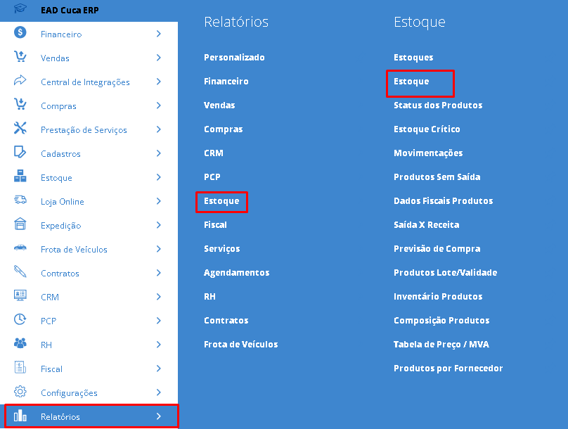 Acesse o menu lateral Relatórios, submenu Estoque e clique em Estoque.