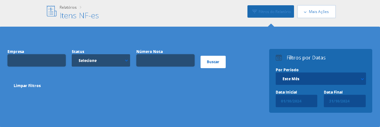 Para gerar este relatório, acesse o menu lateral Relatórios, submenu Fiscal e selecione a opção NF-e Itens.