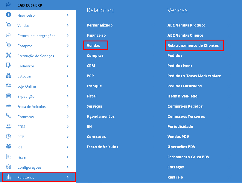 Para verificação dos principais dados de seus clientes, foi desenvolvido o relatório de relacionamento, juntamente com a possibilidade de verificar o fluxo de vendas realizadas para ele. Para isso, acesse o menu lateral Relatórios, submenu Vendas e clique na opção Relacionamento de Clientes.