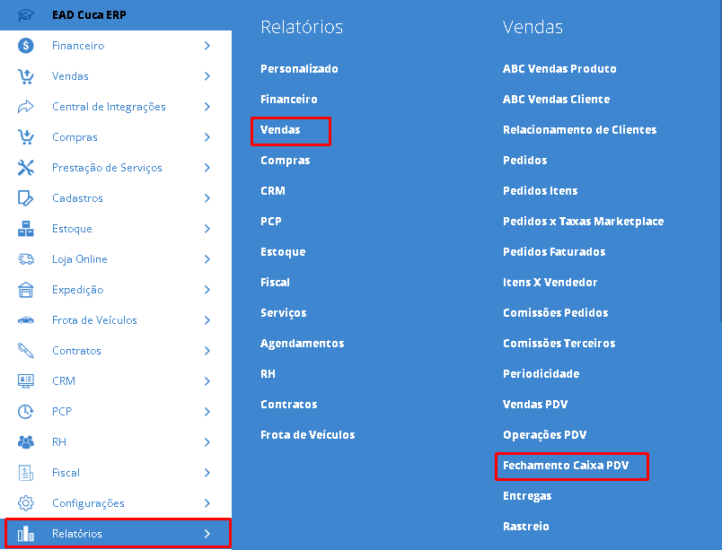 Para reimprimir o fechamento de caixa do seu PDV, basta acessar o menu lateral Relatórios, submenu Vendas e clicar em Fechamento Caixa PDV.