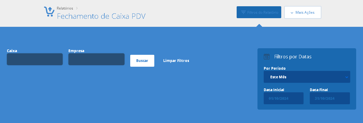 A seguir, o sistema lhe apresentará os filtros para selecionar a data do fechamento de caixa.