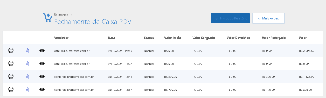 Caixa: informe o e-mail do caixa que realizou o fechamento;