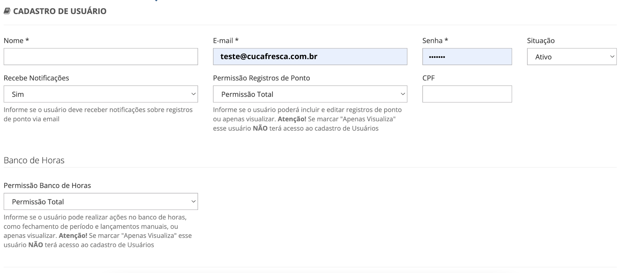O mesmo vale para o campo Permissão Banco de Horas. Caso você utilize o banco de horas do CucaPonto, você poderá informar se o usuário tem Permissão Total, ou seja, pode atuar diretamente no recurso ou se ele Apenas Visualiza as informações.